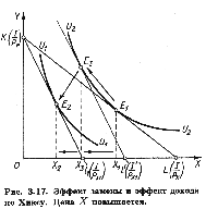 Теперь определим, каким должен был бы быть денежный доход потребителя, чтобы при изменившемся соотношении цен обеспечить ему прежний уровень удовлетворения. Для этого проведем вспомогательную бюджетную прямую K’L’, параллельную линии KL1 (т. е. отражающую новое соотношение цен), так, чтобы она касалась кривой безразличия U1U1 (т. е. обеспечивала бы прежний уровень удовлетворения). Отметим точку касания Е3 и соответствующий объем потребления товара Х3.