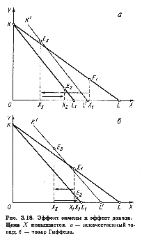 Поэтому, как правило, кривые спроса на такие товары имеют обычно отрицательный наклон, как и в случае нормальных товаров. Лишь если положительный эффект дохода перекрывает отрицательный эффект замены, закон спроса нарушается — его объем изменяется в том же направлении, что и цена. На рис. 3.18,6, например, (X3 – X2) > { X1 – X3). Такие товары называются товарами Гиффена. В действительности потребление большинства товаров требует лишь небольшой части средств потребителя и эффект дохода обычно невелик. Даже если он отрицателен, его размеры недостаточны для того, чтобы перекрыть влияние эффекта замены. Поэтому появление товаров Гиффена маловероятно.