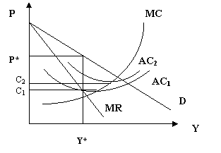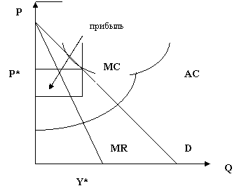 Оптимальный объем выпуска Y* имеет место там, где кривая предельного дохода пересекает кривую предельных издержек. В этом случае монополист назначает максимальную цену P(Y*), которую он может получить при данном объеме выпуска. Это дает монополисту общий доход в размере P(Y*)* Y*, вычитая из которого общие издержки TC(Y*)=AC(Y*)*Y*, представленную на графике площадью прямоугольника.
