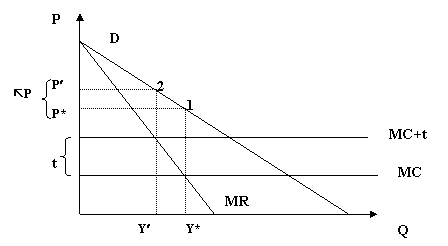 Когда кривая предельных издержек MC (обозначим: c+t) сдвигается вверх на величину налога до кривой MC+t, точка пересечения кривой предельного дохода и кривой предельных издержек сдвигается влево. Поскольку кривая спроса имеет наклон вдвое меньший, чем кривая предельного дохода, цена возрастает на половину суммы налога.