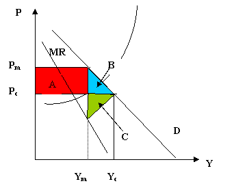Монополия неэффективна. Она производит объем выпуска меньше конкурентного и поэтому является неэффективной по Парето. Существует следующий способ измерить общую потерю эффективности, вызванную монополией. Изменение излишков производителей и потребителей, вызванные переходом от монополистического объема к конкурентному, показаны на рисунке. Излишек монополиста убывает на величину А вследствие снижения цены на единицу выпуска, которые он уже продает. Этот излишек возрастает на величину С благодаря прибыли на добавочные единицы выпуска, которые он теперь продает.
