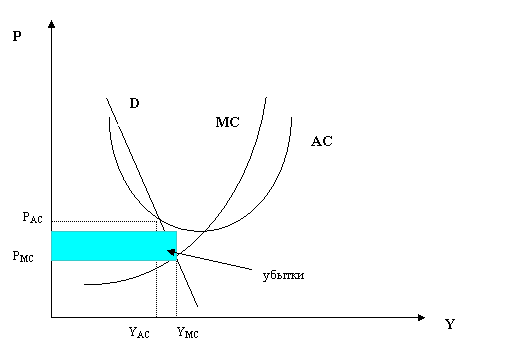 Естественные монополии большей частью регулируются или управляются правительствами. Рассмотрим случай правительственного регулирования естественной монополии. Если регулируемая фирма не должна субсидироваться, она должна получать неотрицательную прибыль, а это означает, что она должна производить в точке, лежащей на или над кривой средних издержек. Если при этом она должна представлять услуги всем, кто готов за это платить, она должна производить также в точке, лежащей на кривой спроса. Следовательно, естественная монополия будет производить в точке, подобной точке (Рас, Yас) на рис. Здесь фирма продает свою продукцию по цене, равной средним издержкам производства, так что она покрывает свои издержки, однако ее выпуск слишком мал по сравнению с эффективным объемом выпуска.