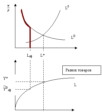 То есть, если уровень производства фирмы определяется производственной функцией (см. выше) и спрос на рынке благ равен Yэф<Y*, то фирма будет предъявлять спрос на труд следующим образом: