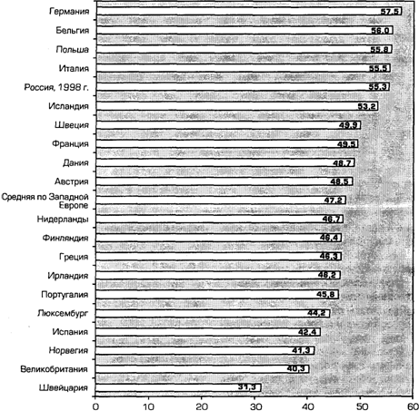 Из приведенных в табл. 12.1 официальных данных следует, что доля ВВП, перераспределяемая через консолидированный бюджет РФ, за 10 последних лет постепенно нарастает и составит в 2000 году 28% ВВП. В 1998 г. она равнялась 24,5% ВВП, еще 8,5% ВВП прошло в 1998 г. через бюджеты государственных внебюджетных социально-страховых фондов. Таким образом, суммарную величину, государственных финансов России в 1998 г. можно оценить как величину, составляющую около 33% ВВП, в 2000 году она должна достигнуть 37%. Много это или мало? Для сравнения посмотрим (табл. 12.2) динамику государственных расходов в индустриально развитых странах (величины доходов государственных финансов и их расходов несколько отличаются, однако для оценки ВВП, перераспределяемого через эти каналы, считаем сравнение возможным).
