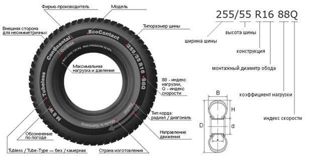 Высота шины (H) – измеряется в процентах от ширины (B). Если этой цифры нет на боковине шины (например, типоразмер выглядит так – 255 R 16), то это значение равно 80% и такая шина называется полнопрофильной;