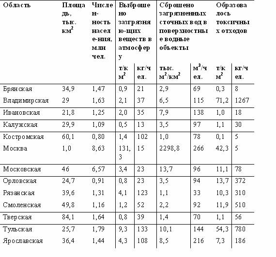 Разберем более подробно один из самых загрязненных экономических районов России – Центральный. Сравнительные данные по удельным показателям загрязнения окружающей среды по этому району приведены в таблице 2.