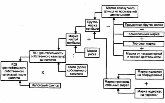 ROI-анализ, проводимый для банка в целом, использует иные принципы расщепления успеха (результата) на компоненты и предлагает специфические базовые величины.