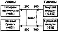 Последовательность расчетов: 1.Средневзвешенная процентная ставка по активам: (200хО%+800х8%)/1000=6,4% и пассивам (300x0,5%+ 700x5%)/1000=3,65% 2,Брутто-маржа: 6,4% - 3,65%=2,75% Расчетная маржа делится пополам 3.Маржа ценных бумаг: (8%-3,65%)/2=2,18% 4.Маржа срочных вкладов: (6,4% - 5%)/2=0,7% |