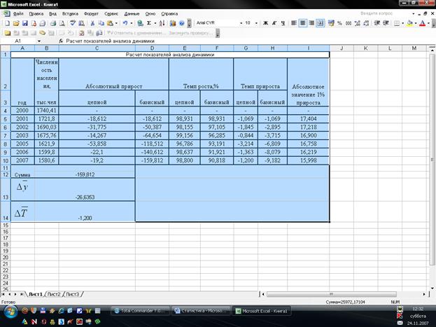 Расчеты показателей анализа динамики численности населения Тульской области выполнены с применением пакета прикладных программ обработки электронных таблиц MS Excel в среде Windows.