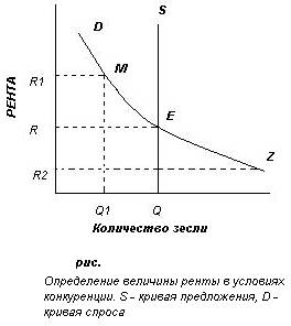 Рента – есть доход, полученный собственником земли при сдачи ее в аренду. Общее предложение земли в отличие от других факторов производства относительно фиксировано природой и не может быть увеличено в ответ на более высокую цену или уменьшено в случае низкой цены.