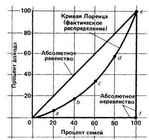 Чем сильнее изогнута кривая Лоренца одного года, тем менее равномерным является распределение доходов в этот период. Для сравнения построим кривую абсолютного равенства, т. е. совершенно равномерного распределения. В таком случае первые 20% населения получали бы ровно 20% всех доходов, 40% населения - 40% всех доходов и т. д. Соответствующая кривая Лоренца приняла бы тогда форму прямой (см. рис.), проходящей из нижнего левого угла (x=0, y=0) в правый верхний (x=100%, y=100%). На рисунке видно, что кривая Лоренца 2003 года отклоняется от гипотетического графика абсолютно равномерного распределения в большей степени, чем кривая Лоренца 170 года. Это означает, что в 2003 году существует наиболее острое неравенство в распределении доходов.
