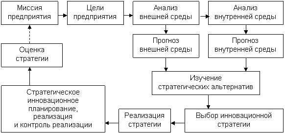 На этой основе формируются и исследуются возможные альтернативы, осуществляется выбор и реализация стратегии. После оценки результатов реализации стратегического инновационного плана возможна корректировка миссии и целей деятельности предприятия (рис. 7.2).