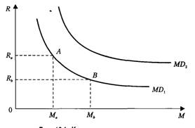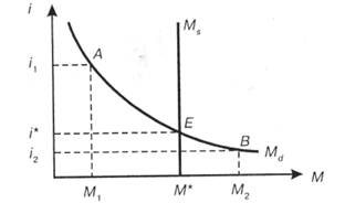 1. Сеть институтов, обеспечивающих взаимодействие предложения и спроса на деньги, называется денежным рынком. Однако использовать этот термин следует с оговоркам. Дело в том, что термин «денежный рынок» означает рынок краткосрочных высоколиквидных ценных бумаг. Во-вторых, следует подчеркнуть, что деньги, «не продаются» и «не покупаются» в том же смысле, что продаются и покупаются товары. При сделках на рынке денег, деньги обмениваются на другие ликвидные активы по альтернативной стоимости, измеренной в единицах номинальной нормы процента. Как и на любом ином рынке, равновесие на денежном рынке имеет место в пересечении кривых спроса и предложения. Равновесие на рынке денег означает равенство количества денег, которые агенты хотят сохранить в своих портфелях активов, количеству денег, предлагаемому Центральными банками, при осуществлении текущей денежно-кредитной политики.