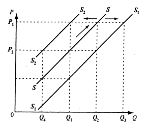 Кривая предложения сдвинется вправо от SS к S1S1 ,если при тех же затратах на рынке предлагается больше продукции. Уменьшение же предложения товара сместит кривую предложения влево от SS к S2S2.