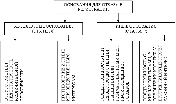 Основанием для различения абсолютных и иных оснований является природа свойств товарного знака, не позволяющая произвести его регистрацию. В качестве абсолютных оснований выступают собственные качества товарного знака, в качестве иных - качества, возникающие в отношении к другим явлениям.