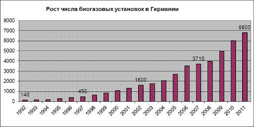 Германия – самый крупный производитель в Европе, у нее 7 000 установок общей производительностью, сравнимой с мощностью 2 атомных электростанций. В 2010 г. она произвела 15 000 ГВт•ч электричества, что составляет больше половины всего биогаза, потребляемого в Европе. Льготный тариф на покупку электроэнергии и премия за выращивание энергетических культур, введенная в 2004 г. (в результате, тариф колеблется от 19 до 25 сантим/кВт•ч), вызвали настоящий бум в отрасли, в 2004 – 2010 г. г. было запущено в эксплуатацию приблизительно 4000 новых установок. В 2010 г. электричество, выработанное благодаря биогазу, составляло 2,6% общего объема потребления в Германии.
