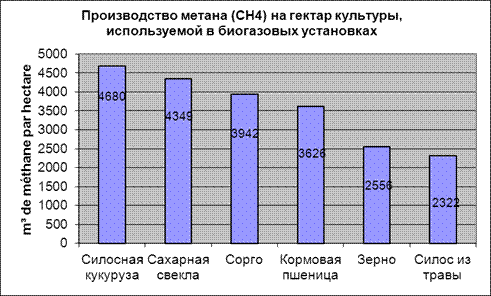 Немецкие установки функционируют на смешанном сырье: силосная кукуруза и отходы жизнедеятельности животных. Благодаря выработке 200м³ биогаза из тонны сырья брутто, кукуруза является наиболее выгодной для производства биогаза культурой. Кукурузу используют практически во всех странах, где развита метанизация. В 2011 г. в Европейском Союзе 811 000 га было засеяно кукурузой для последующей переработки на биогаз, 650 000 га из которых находятся в Германии. Другие культуры, такие как сорго и сахарная свекла, также используются для производства биогаза.