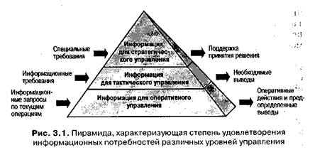 Содержание каждой конкретной информации определяется потребностями управленческих звеньев и вырабатываемых управленческих решений. Управление - это целенаправленная деятельность, использующая главным образом информационный поток. На рис. 3.1 представлена информационная пирамида, отражающая информативность данных и характеризующая степень удовлетворения потребностей в информации различных уровней системы управления.