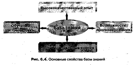 База знаний — это совокупность моделей, правил и факторов (данных), порождающих анализ и выводы для нахождения решений сложных задач в некоторой предметной области. Выделенные и организованные в виде отдельных, целостных структур информационного обеспечения знания о предметной области становятся явными и отделяются от других типов знаний (например, общих знаний). Базы знаний позволяют вести рассуждения не только и не столько на основе формальной (математической) логики, но и на основе опыта, фактов, эвристик, т. е. базы знаний приближены к человеческой логике (рис. 6.4).
