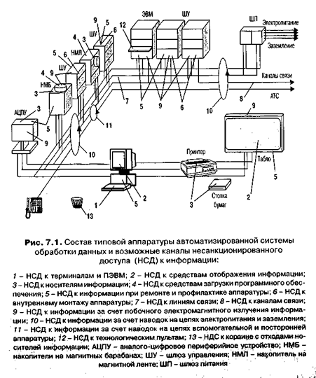 Возможные пути умышленной дезорганизации работы, вывода системы из строя, проникновения в систему и несанкционированного доступа к информации рассмотрены выше при описании искусственных преднамеренных угроз. На рис. 7.1 представлен состав типовой аппаратуры автоматизированной системы обработки данных и возможные каналы несанкционированного доступа к информации.