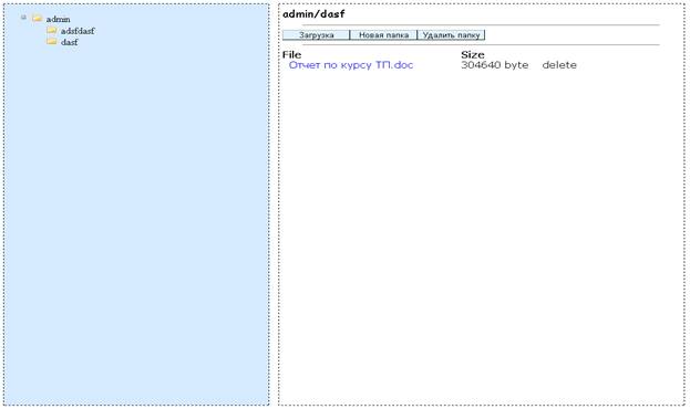 Почти вся функциональность проекта осуществляется при использовании этой страницы. Страница разделена на 2 окна. В первом окне(левое) отображена личная папка пользователя (со всеми папками и файлами в ней).