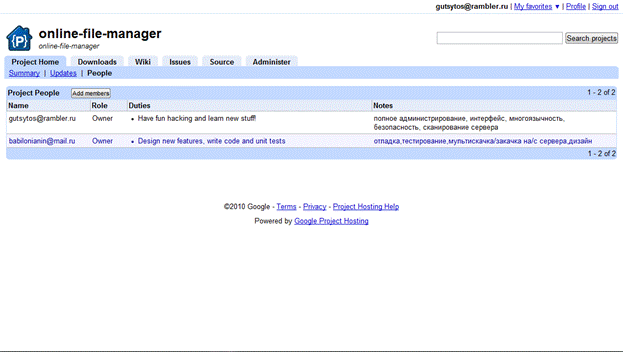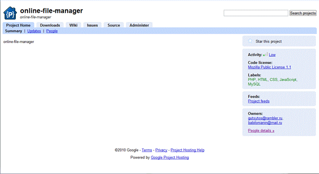 Для системы контроля версия мы использовали SVN. Для этого мы пользовались услугами сайта www. code. . Название нашего проекта online-file-manager. Разместив проект там, мы тут же приступили к постепенному выполнению проекта.