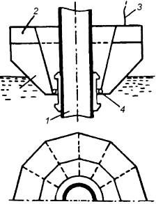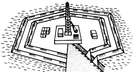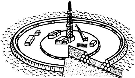 На внешнем крае кольца по периметру всего острова устраивается парапет для исключения волновых и ледовых воздействий на рабочую площадку. Следует иметь в виду, что в плавучей кольцевой конструкции уже заранее смонтированы силовая и насосная станции, технологическое оборудование, подготовлены отсеки для хранения нефти и т. п.