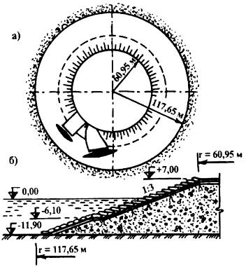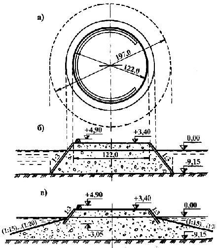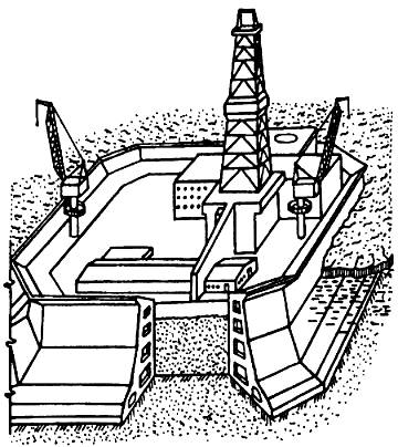 Общие сведения и положения. Как уже излагалось, для возведения искусственных грунтовых островов требуется большое количество сыпучих материалов (песка, гравия). Расход материалов существенно возрастает с увеличением глубин (пропорционально кубу глубины). При укреплении откосов острова защитным покрытием, расход грунтовой массы уменьшается, однако общее необходимое количество грунта остается большим. При этом требуются капиталовложения на защиту откосов и на восстановительные работы по ликвидации периодических разрушений откосов от воздействия волн и льда. Уже отмечалось, что, по мнению зарубежных специалистов, возведение откосных островов из грунта рационально на глубинах до 15…20 м.
