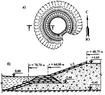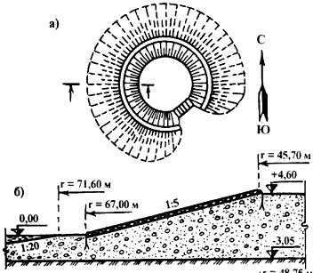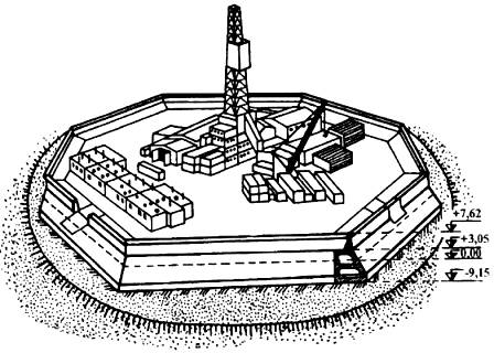 Остров Кадлук с ограждением из стальных массивов-гигантов на глубине 13,6 м.Остров возведен в канадской части моря Бофорта в районе устья реки Маккензи на глубине 13,6 м и эксплуатируется с августа 1983 г. (рис. 16). Стальные массивы-гиганты изготовлялись в Японии. Остров предназначен для круглогодичного разведочного бурения, конструкция его позволяет передислокации на другие места эксплуатации. Это первый остров в море Бофорта с ограждением из массивов-гигантов. Ледовые условия: воздействие ледяных полей толщиной 2…3 м (коэффициент запаса принят 1,7 при толщине льда 2 м и 1,2 при толщине льда 3 м).