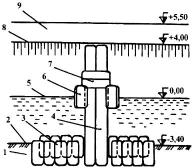 Обычно высота массивов-гигантов делается такой, чтобы они в установленном в конструкции острова состоянии возвышались над водой до отметки рабочей площадки острова, а подошвы их находились на глубине около 9…10 м ниже расчетного уровня воды. По поверхности морского дна устраивается песчано-гравийная постель, верх которой также должен( )быть на глубине 9…10 м. Массивы-гиганты устанавливаются на горизонтальную поверхность постели. Толщина постели зависит от глубины моря в месте острова и может быть значительной. Устройство постели производится намывным или насыпным способами. После установки массивов-гигантов на постель производится заполнение ядра острова сыпучим материалом.
