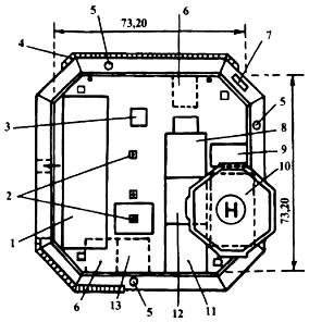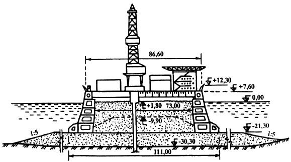, возвышается над ватерлинией на 7,6 м (рис. 19). По периметру надводного строения располагается парапет-дефлектор высотой 4,7 м, предназначенный для отражения волн и битого льда. В системе палубной надстройки расположено технологическое оборудование и запасы материалов, энергетическая установка (5 дизелей по 4300 кВт), вертолетная площадка, жилые помещения на 100 человек и др. Остров оборудован кранами грузоподъемностью по 65 тс.