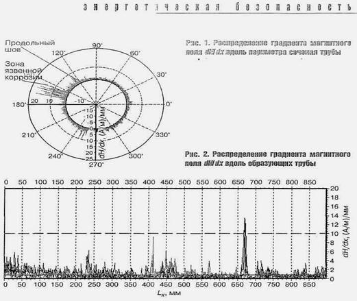 Магнитограмма, характеризующая напряженно-деформированное состояние в одном из сечений трубы диаметром 1020 мм с локальным изменением поля Н и градиента поля dH/dx характеризует наличие дефектов в виде вмятин и язвин наружной коррозии (рис. 4).