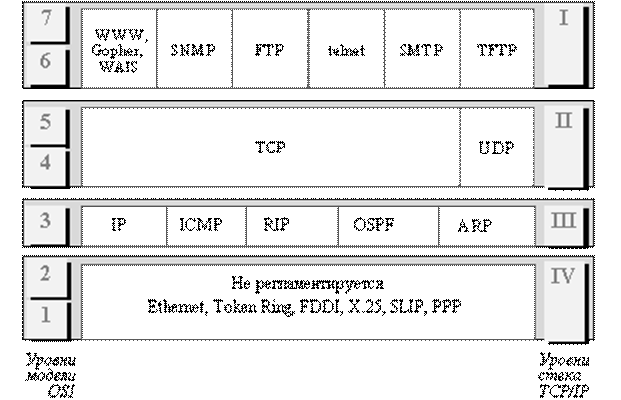 Стек TCP/IP был разработан до появления модели взаимодействия открытых систем OSI, имеет многоуровневую структуру, соответствие уровней стека TCP/IP уровням модели OSI достаточно условно.