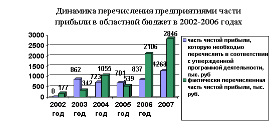 По итогам деятельности за 2006 год 13 предприятий в 2007 году перечислили в областной бюджет часть чистой прибыли на общую сумму 2 845 907,13 рублей. Бюджетное задание было выполнено в полном объеме.