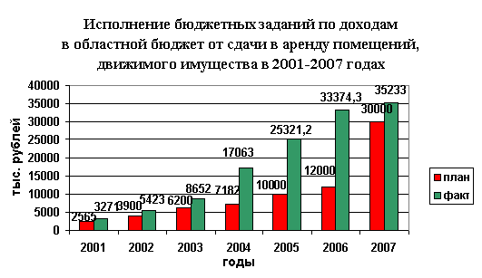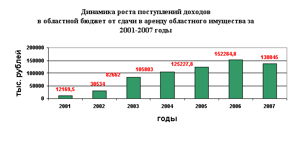 Законом Читинской области от 01.01.01 года «Об областном бюджете на 2007 год» установлено задание по обеспечению поступления в областной бюджет доходов от сдачи в аренду имущества в размере 165 836,0 тыс. рублей, в том числе: