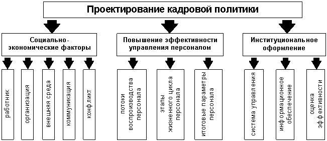 - передовой опыт транснациональных корпораций - институционализация представлений о субъекте и объекте проектирования, а также системе взаимодействия между ними, формирование и развитие необходимого списка компетенций; - оптимизации воздействия на основные элементы кадровой политики: потоки воспроизводства, этапы жизненного цикла и итоговые параметры персонала; по параметрам: количества, качества, стоимости и времени. |