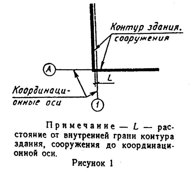 Когда расстояние от наружной грани стены здания, сооружения до координационной оси в масштабе изображения превосходит толщину линии контура, последнюю относят от координационной оси на соответствующее расстояние (L) в соответствии с рисунком 1.