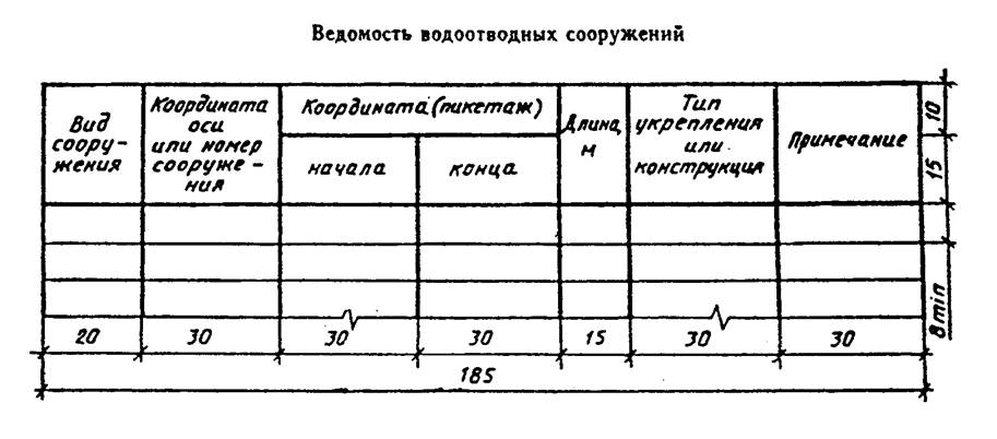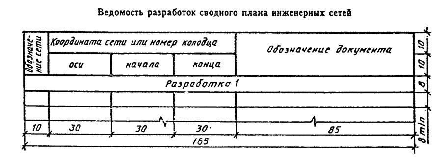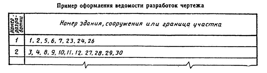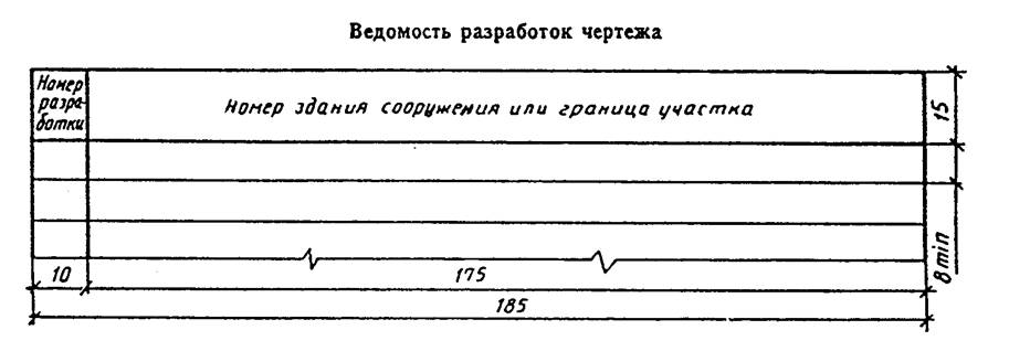 Над основной надписью помещают ведомость разработок чертежа: для разбивочного плана, планов организации рельефа, земляных масс и благоустройства территории - по форме 1, для сводного плана инженерных сетей - по форме 2.