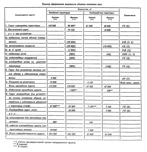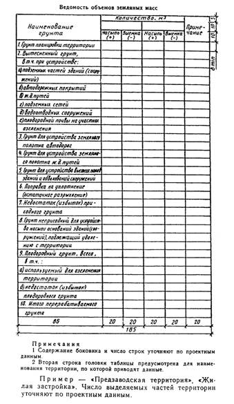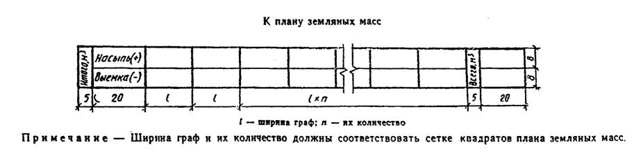 7.7. Примеры оформления плана земляных масс и ведомости объемов земляных масс приведены соответственно в приложениях К и Л. Примеры разработаны для случая выполнения вертикальной планировки до начала возведения зданий и сооружений.
