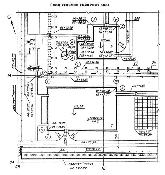 9.1. План благоустройства территории выполняют на основе разбивочного плана без указания координационных осей, координат и размерных привязок, абсолютных отметок зданий, сооружений.