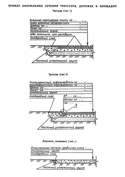 г) разрезы, сечения и узлы тротуаров, дорожек и площадок. Пример оформления сечений тротуаров, дорожек и площадок приведен в приложении С;