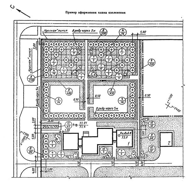 Для рядовой посадки деревьев и кустарников приводят размерную привязку ряда.