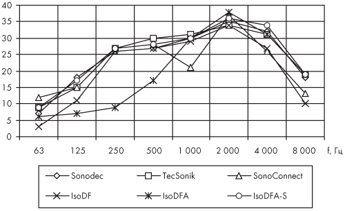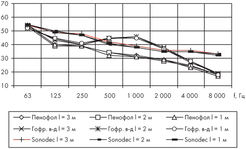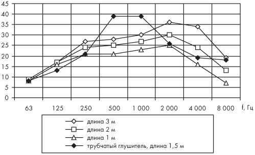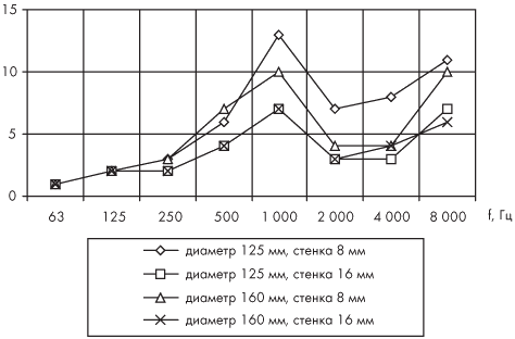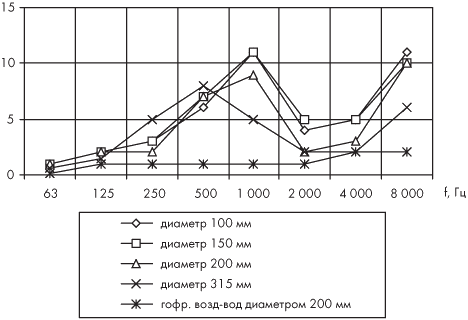 Рис. 3. Снижение уровней шума в воздуховодах из «Пенофола» длиной 1 м и толщиной стенки 8 мм