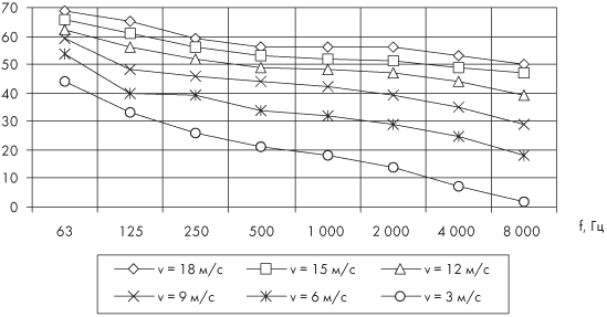 Рис. 6. Уровни генерируемого шума воздуховодом из «Пенофола» длиной 3 м в зависимости от скорости потока