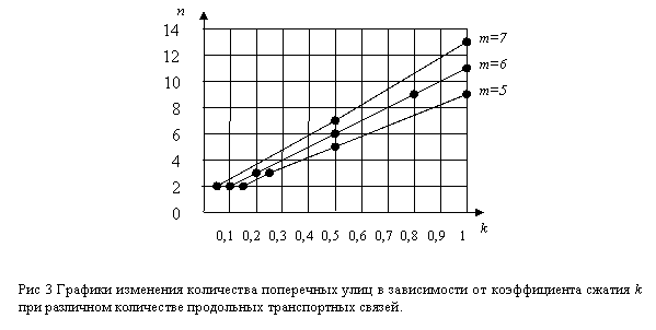 2. Из (3) получаем необходимое количество поперечных улиц. Меняя длину квартала в (или тот же коэффициент k), получаем в соответствии с (3) разное количество поперечных улиц, в соответствии с (4) - соответствующую протяженность УДС LR, а в соответствии с (5) - перекрестков П.