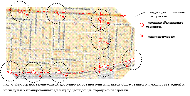 - на фрагмент карты с планировочной единицей наносятся линии движения общественного транспорта и остановочные пункты (рис. 5). Вычисляются факторы, определяющие доступность: радиусы обслуживания остановочных пунктов, время поездки на общественном транспорте, суммарная протяженность и плотность улично-дорожной сети;
