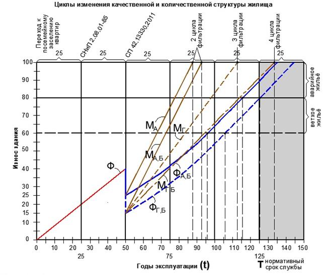 Физический износ зданий модернизированных по проектам, предложенным в работе, уменьшится до 25%, а реконструированных – в среднем до 15%. Кривые описывающие эксплуатацию с соблюдением сроков проведения ремонтов смещены в точки возобновления жизненного цикла модернизированных и реконструированных зданий соответственно. Моральный износ наступает независимо от физического, и представляет собой снижение и утрату эксплуатационных качеств зданий, вызываемую изменением нормативных требований к их планировке, благоустройству, комфортности. Установлены 25-ти летние циклы изменения качественной и количественной структуры жилища, которые в совокупности с процессами жилищной фильтрации положены в основу определения морального износа зданий на основании линейных зависимостей. Функциональная жизнь зданий жилой застройки х гг. полностью исчерпана, но острейший дефицит нового жилья, соответствующего современным требованиям, делает их востребованными на вторичном рынке жилья, продолжая их экономическую жизнь.