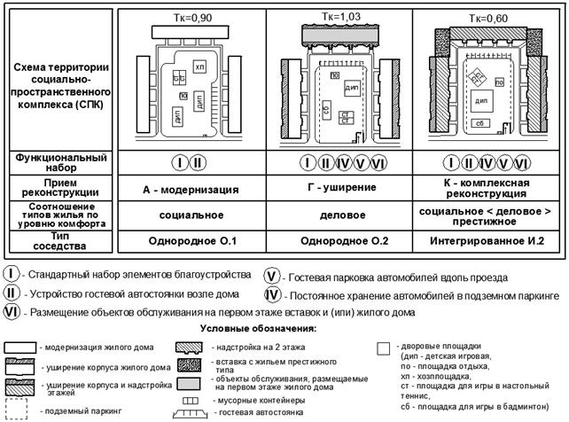4. Предложены градостроительные показатели - обеспеченность территорией и коэффициент уровня комфорта дворового пространства, которые характеризуют эффективность использования территории жилого двора в рамках социально-пространственного комплекса. Улучшение проживания наблюдается при формировании социально-пространственного комплекса, представленного однородным среднеобеспеченным соседством, проживающем в уширенных жилых домах. Комфорт использования дворового пространства, остающегося неизменным при реконструкции, снижается при применении надстройки и вставок. Но в формируемых при помощи этих приемов комплексах повышаются показатели обеспеченности жильем и обслуживанием, что дает возможность проектировать их на территориях с высокой градостроительной ценностью, например, в центральной зоне крупного «нового» города, предусматривая проживание соседства представленного несколькими социальными классами.