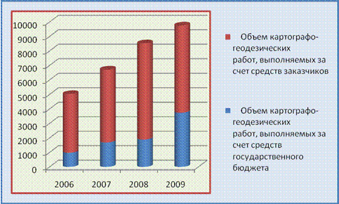 По сравнению с 2006 годом объём геодезических и картографических работ в 2008 году в целом по отрасли вырос более чем в 1,8 раза, в том числе, за счёт федерального бюджета – в 2,4 раза, за счёт средств заказчиков – более чем в 1,6 раза. В 2009 году с учётом секвестрования объём топографо-геодезических и картографических работ за счёт федерального бюджета для федеральных государственных нужд составил 3736,1 млн. рублей и по сравнению с 2006 годом увеличился в 4,7 раза (таблица 3, рис. 6).