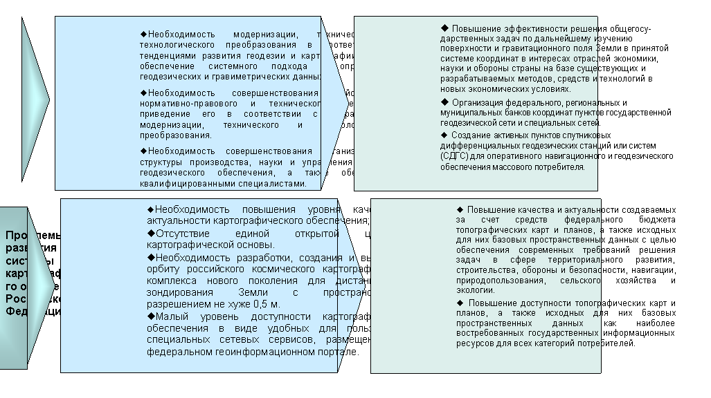 - проблемы, вызванные необходимостью дальнейшего развития государственного регулирования геодезической и картографической деятельности в Российской Федерации с целью приведения нормативно-правового обеспечения функционирования отрасли в соответствие с решаемыми задачами в условиях осуществления модернизации, технического и технологического преобразования и организационной перестройки;